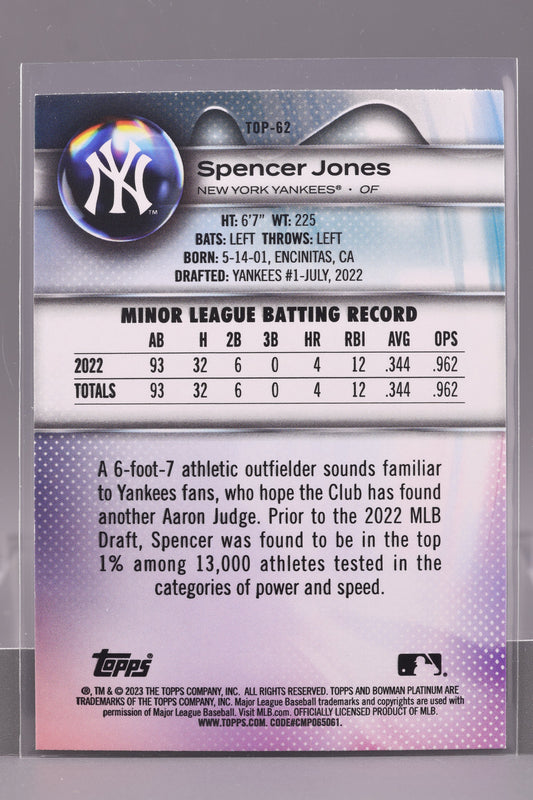 Spencer Jones 2023 Bowman Platinum #TOP-62 Top Prospects New York Yankees