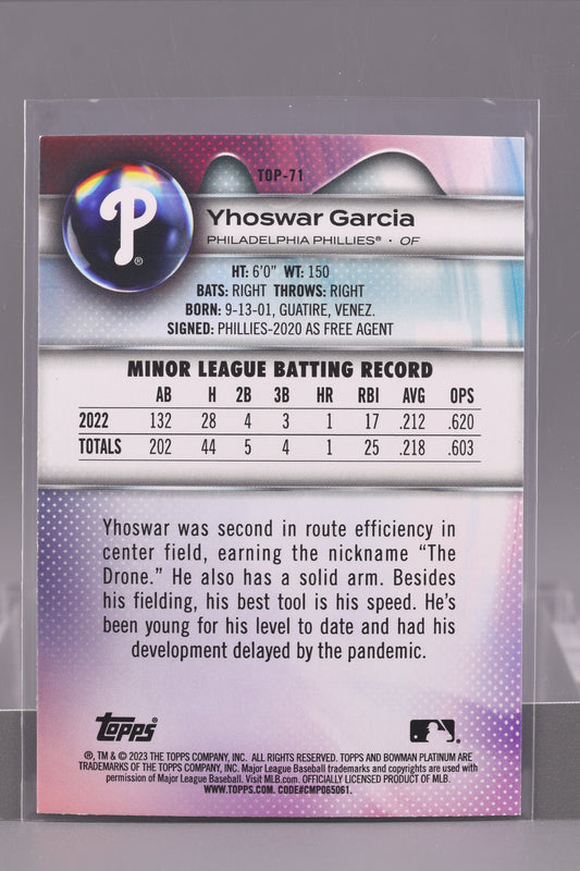 Yhoswar Garcia 2023 Bowman Platinum Top Prospects #TOP-71 Philadelphia Phillies