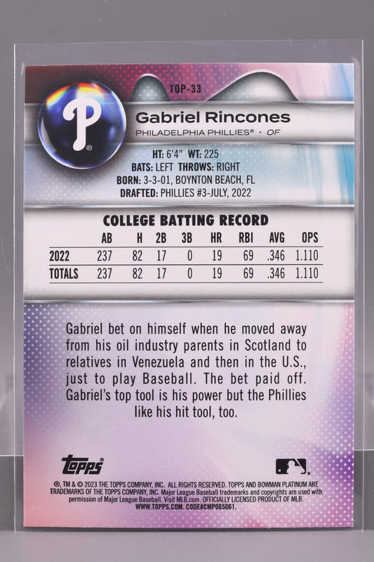 Gabriel Rincones 2023 Bowman Platinum #TOP-33 Top Prospects Philadelphia Phillies
