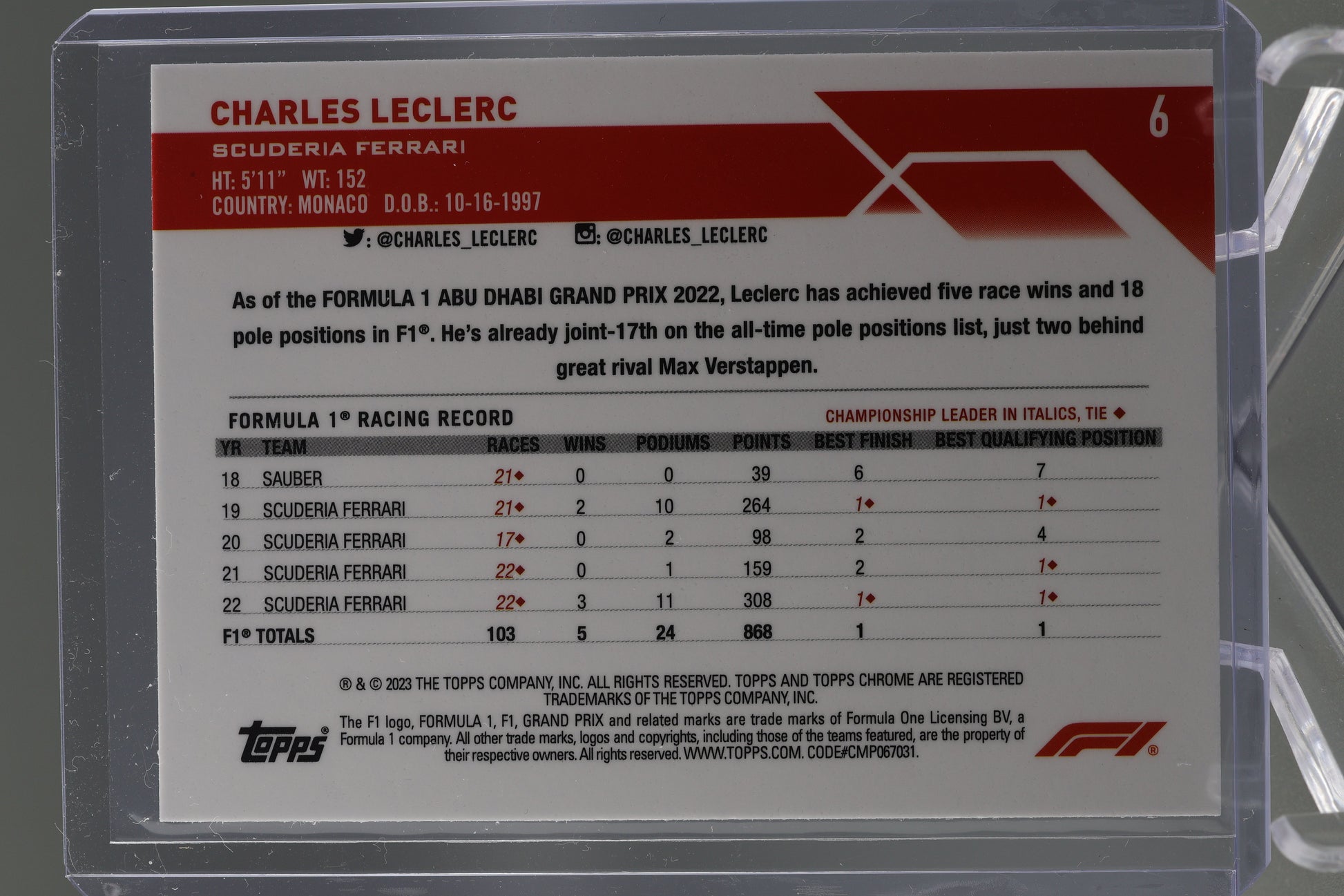 Charles Leclerc 2023 Topps Chrome Formula 1 #6 Scuderia Ferrari