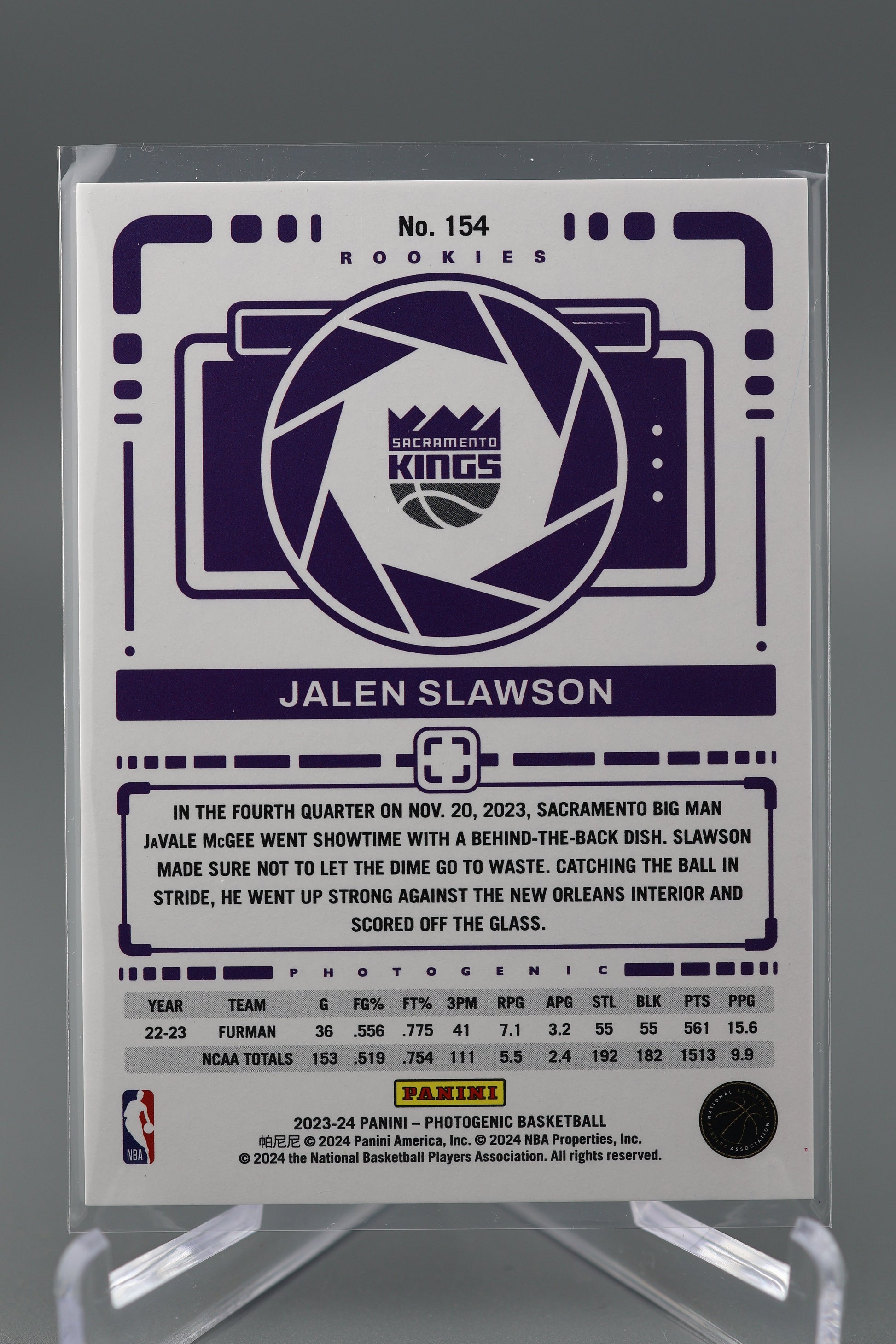 You are purchasing a Jalen Slawson 2023 Photogenic #154 Sacramento Kings. You will receive the exact item in the photographs. Thank you for looking. Listed With Mascot.